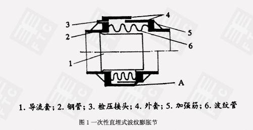 一次性直埋膨脹節結構型式見(圖1)其工作原理是將該種產品裝在管道上后,給管道加熱到要求的溫度,管道熱伸長,波紋膨脹節被相應壓縮,在此狀態下將外套4在A環縫處密封焊接,補償后的膨脹節為剛性整體,用一次性直埋式波紋補償器、膨脹節補償了該段管路在設計溫差下產生變形,它的作用使管路工作中拉伸或壓縮的平衡點處在設計溫差下變形總量的中點。使拉伸、壓縮應力基本相等,起到降低管路拉伸或壓縮變形應力的作用。