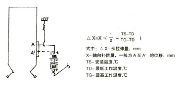 △Y。以_補(bǔ)償器能在水平狀態(tài)下工作。 5.22 靠近燃燒器入口處垂直安裝,此時(shí)補(bǔ)償器主要通過(guò)軸向伸縮以及少量橫向撓曲來(lái)吸收位移。為減少A點(diǎn)受力,補(bǔ)償器按預(yù)拉伸狀態(tài)安裝,預(yù)拉伸量按下式計(jì)算: