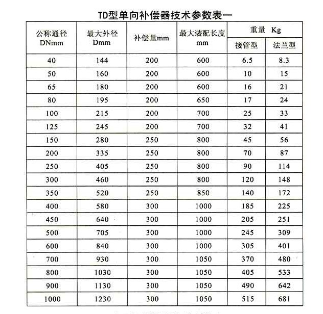 1、TD型單向補(bǔ)償器技術(shù)參數(shù)見表1,結(jié)構(gòu)型式見圖一。